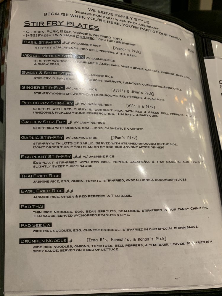 Stir-fry with eggplant, white onion, red bell pepper, jalapeo, & Thai basil in our savory/slightly sweet Chimm sauce. Vegan/Gluten Free possible.